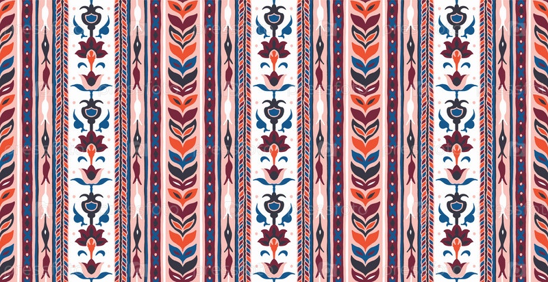 Геометрический дамасский орнамент. Икат границы. Этническая вышивка с листьями и монограммами. Племенная векторная текстура. Бесшовный народный узор в ацтекском стиле. Индийский, скандинавский, цыганский, мексиканский, африканский ковер