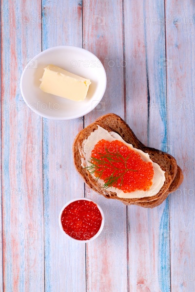 Бутерброд с красной икрой и маслом на синем деревянном столе. Вид сверху