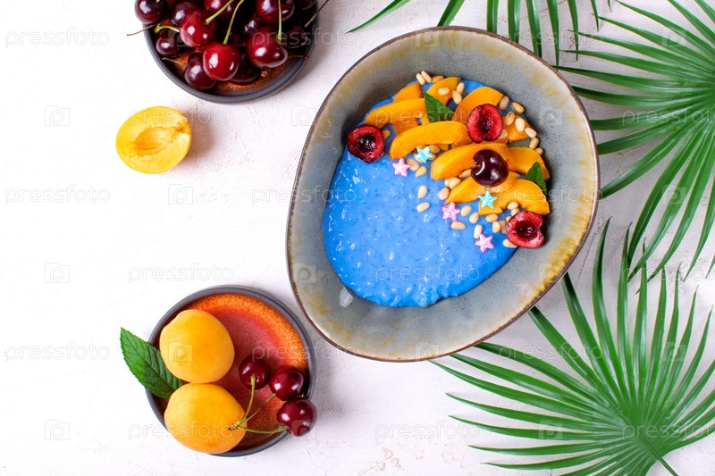 Каша из синего риса со спирулиной, абрикосом, вишней и кедровыми орехами в керамической миске. Здоровый завтрак. Вид сверху