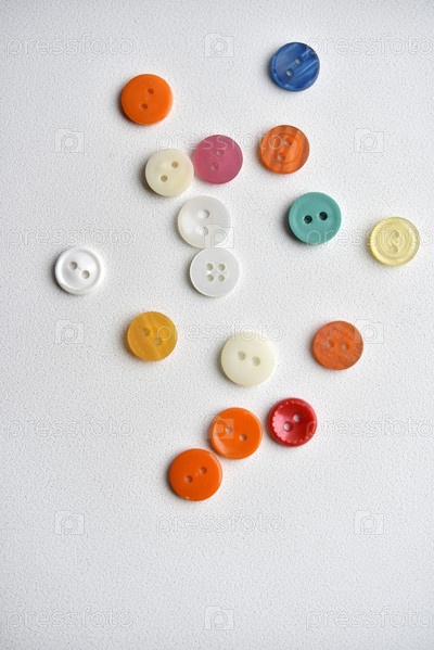 Разноцветные кнопки на белом фоне. Круглые пуговицы от одежды
