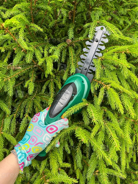 Рука огородницы-женщины в защитных перчатках разрезает с помощью секатара живую ограду из тиса, обрезанную Taxus baccata