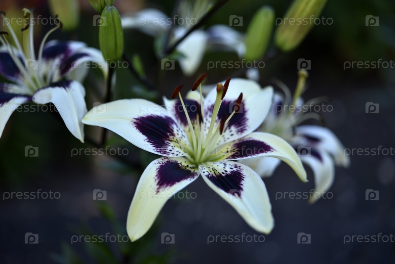 Красные белые и оранжевые цветы лилии в саду. Лилии - большие цветы. Красивые цветы крупным планом