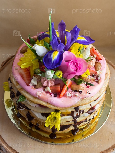 Торт Milkygirl из белого крема с шоколадным глазурем, украшенный цветами и ягодами