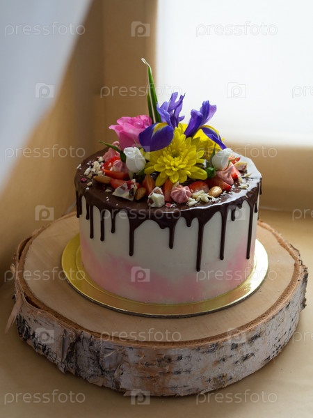 Торт Milkygirl из белого крема с шоколадным глазурем, украшенный цветами и ягодами