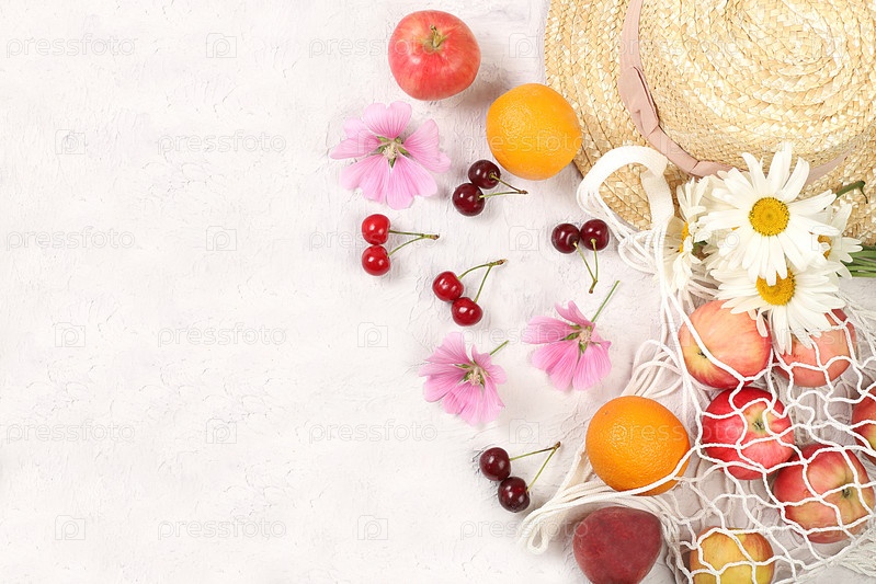 Соломенная шляпа, фрукты в эко-сумке и цветы ромашки на солнечном столе. Летний модный баннер на ярком фоне. Концепция отдыха и путешествий, отдых на свежем воздухе и праздничная вечеринка. Вид сверху