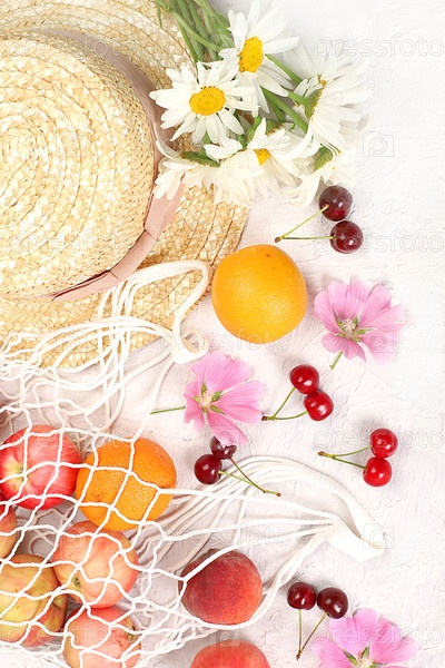 Летний модный баннер на ярком фоне. Концепция отдыха и путешествий, отдых на свежем воздухе и праздничная вечеринка. Соломенная шляпа, фрукты в эко-сумке и цветы ромашки на солнечном столе. Вид сверху,