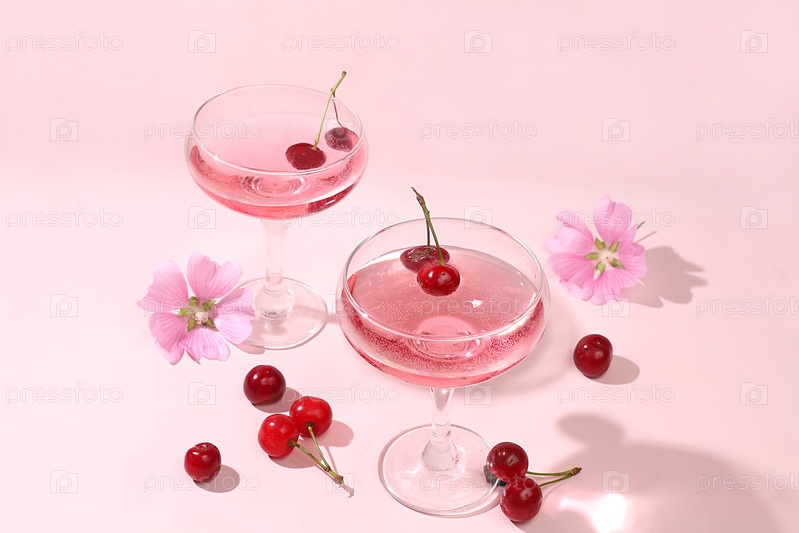 Современный натюрморт с розовым вином, алкогольным коктейлем и ягодами вишни на элегантном современном фоне, минимальная концепция бара, кафе, рекламный баннер, выборочный фокус, место для текста