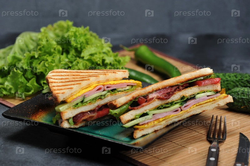 Бутерброды треугольной формы с ветчиной и омлетом на тарелке