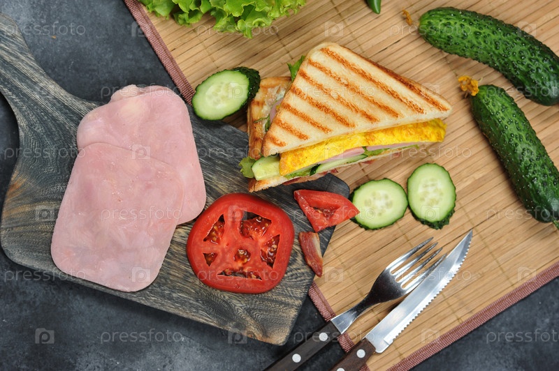 Вид сверху на бутербродный тост с салатом, ветчиной, яйцом