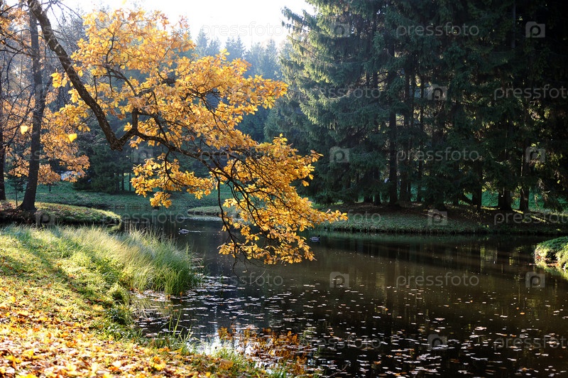 Осенний пейзаж-желтые дубовые листья над озером