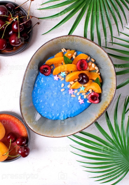 Каша из синего риса со спирулиной, абрикосом, вишней и кедровыми орехами в керамической миске. Здоровый завтрак. Вид сверху
