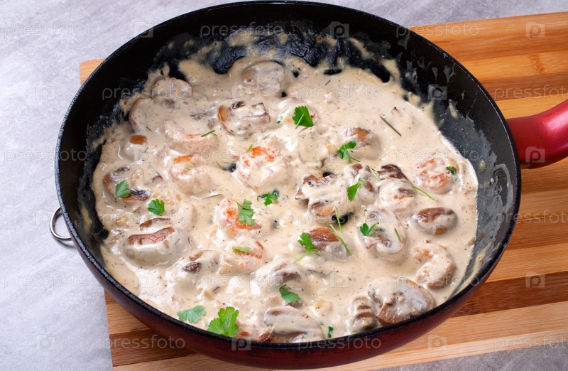 Готовим креветки в сливочном соусе с шампиньонами на сковороде. Приготовление блюда из морепродуктов