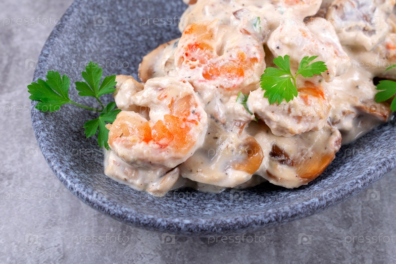 Креветки в сливочном соусе с шампиньонами на тарелке. Еда из морепродуктов