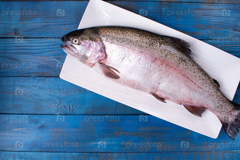 Свежая вся радужная форель на синем деревянном столе. Вид сверху