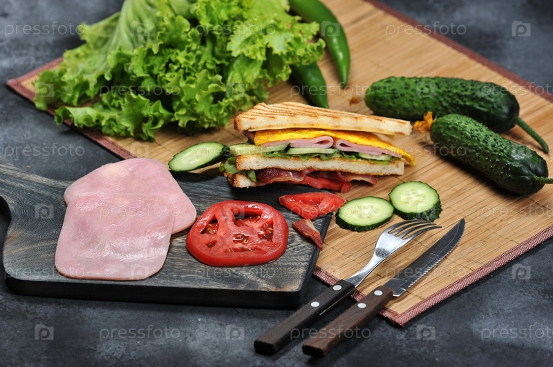 Бутерброды треугольной формы с ветчиной и омлетом на тарелке