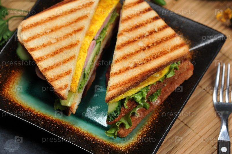 Бутерброды треугольной формы с ветчиной и омлетом на тарелке