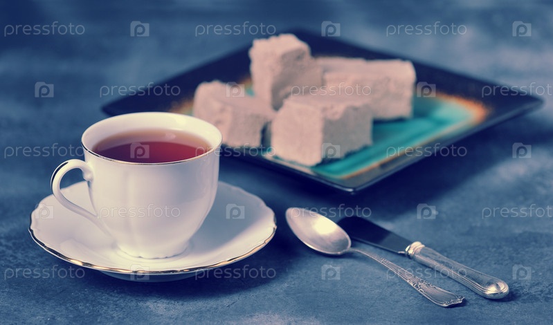 Чай в кружке с золотым краем и блюдце и нарезанная на кусочки халва