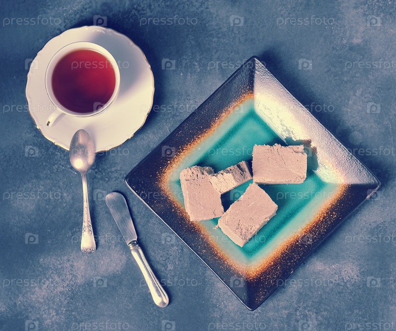Чай в кружке с золотым краем и блюдце и нарезанная на кусочки халва