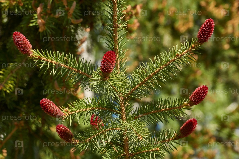 Женский еловый конус в городском парке. Созревают еловые шишки. Весна
