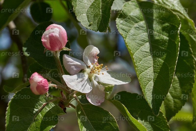 Яблоневые цветы на фоне кроны дерева и голубого неба. Яблоня цветет в саду. Весна
