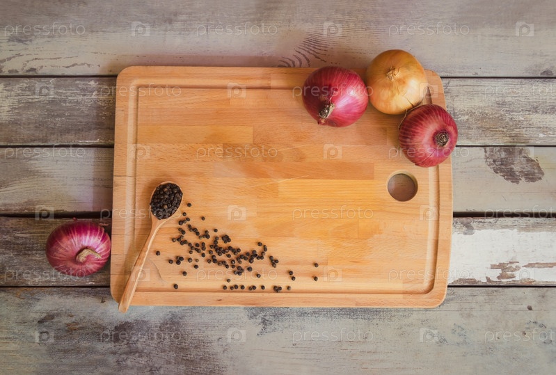 Разделочная доска, свежий лук и черный перец на старом деревянном фоне
