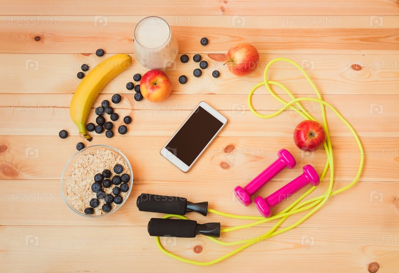 Стакан йогурта, фрукты, овсяные хлопья, скакалка, гантели и смартфон на деревянном фоне
