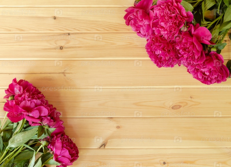 Красные пионы на деревянном фоне. Плоская укладка. Место для текста