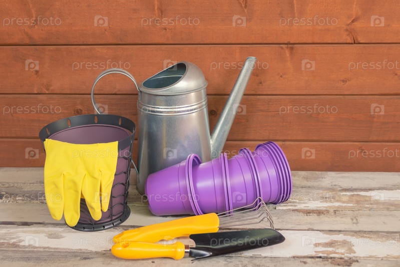 Фиолетовые пластиковые цветочные горшки, лейка, перчатки и желтые садовые инструменты на старом деревянном столе