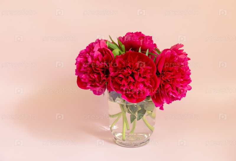 Красные пионы в стеклянной вазе на розовом фоне