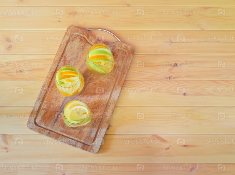 Сангрия из белого вина с фруктами в стаканах на разделочной доске