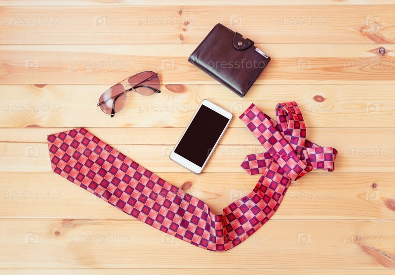 Стильный галстук, кошелек, смартфон и солнцезащитные очки на деревянном фоне