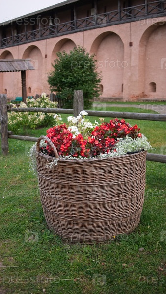 Корзинка с цветами на фоне красной стены