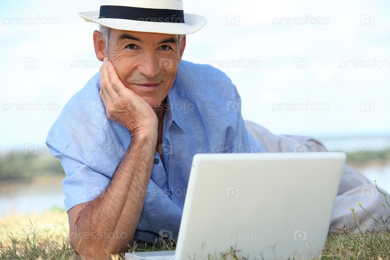 Мужчина с ноутбуком на открытом воздухе