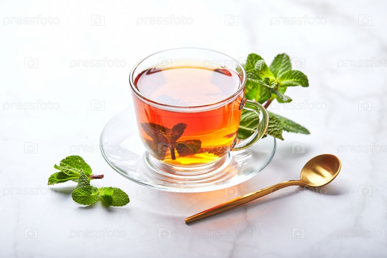 Черный чай в стеклянной прозрачной кружке с листьями мяты. Успокаивающий чай, антистресс