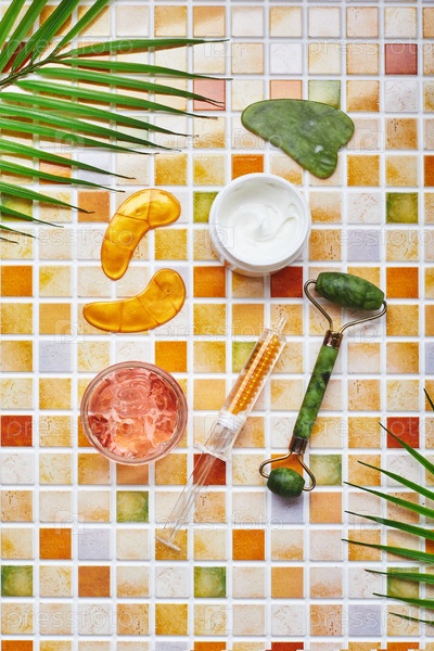 Баночки с кремом и гелем для ухода за лицом и телом, золотые повязки для глаз и сыворотка с золотом в шприц-тюбике и нефритовый роликовый массажер гау-ша на фоне плиточной мозаики
