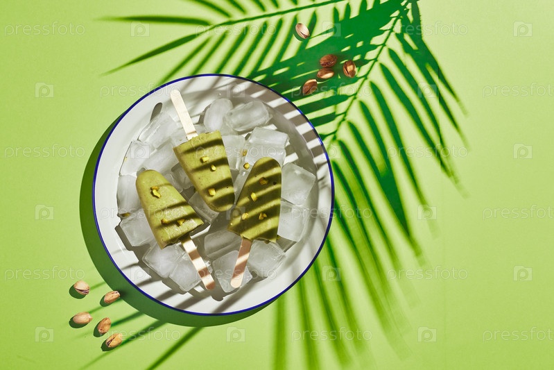 Замороженное домашнее фисташковое эскимо в миске со льдом на зеленом фоне с тенью пальмового листа в резком свете. Освежающее эскимо, замороженный зеленый сок на палочке. Вид сверху, пространство для копирования