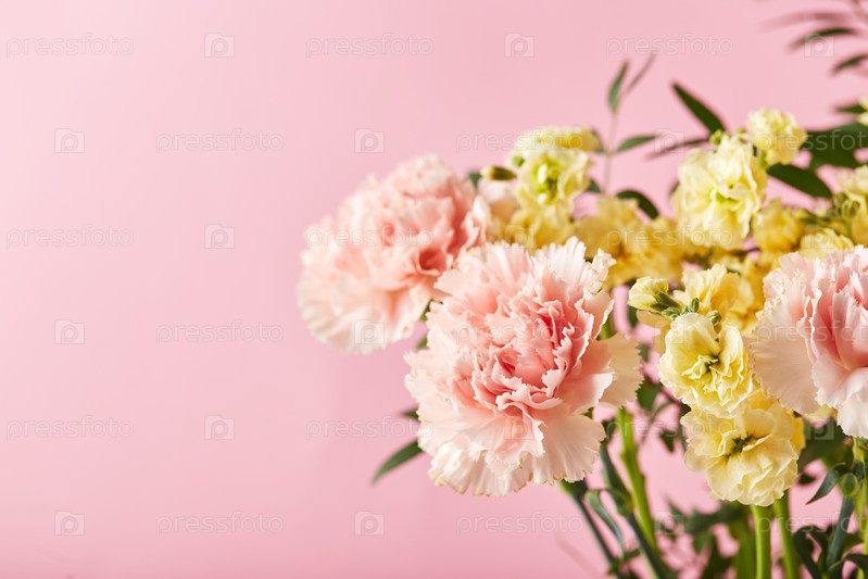 Букет из розовых гвоздик и желтой маттиолы с зелеными ветками. Концепция дизайна праздничного поздравления с букетом гвоздик на розовом фоне