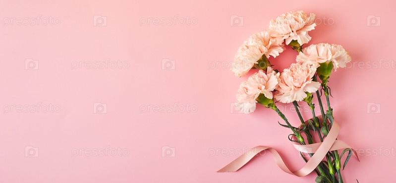 Букет розовых гвоздик. Концепция дизайна праздничного приветствия с букетом гвоздик на фоне розового стола