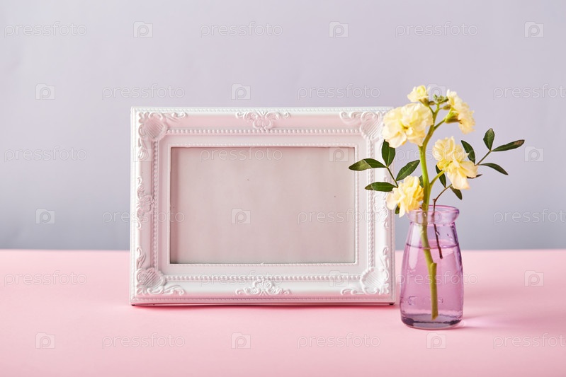 Цветок желтой маттиолы в маленькой стеклянной вазе с белой фоторамкой. Концепция дизайна праздничного поздравления на розовом столе