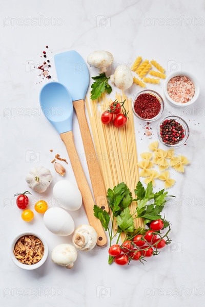 Пищевой фон с различными видами макарон, помидоров, трав, грибов, яиц, приправ, разбросанных на светлом мраморном фоне, вид сверху. Концепция итальянской кухни