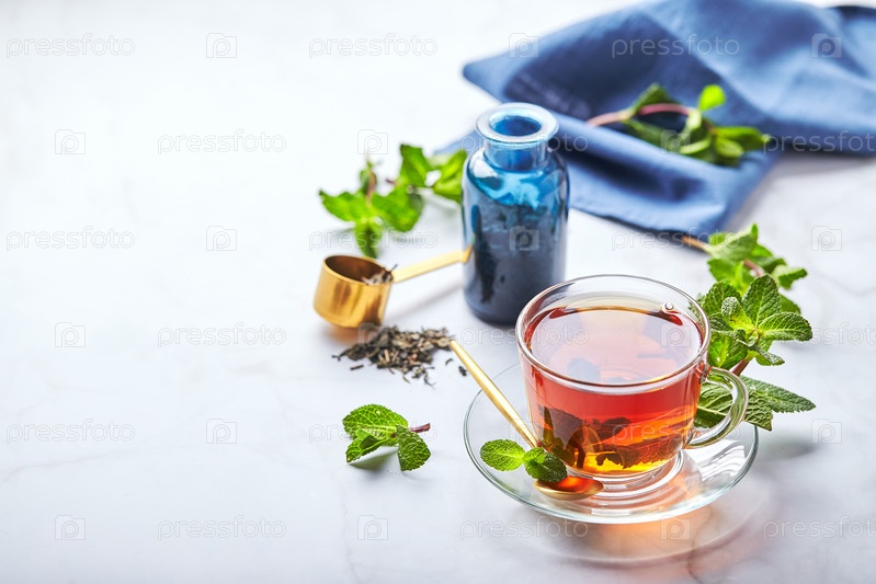 Черный чай в стеклянной прозрачной кружке с листьями мяты. Успокаивающий чай, антистресс