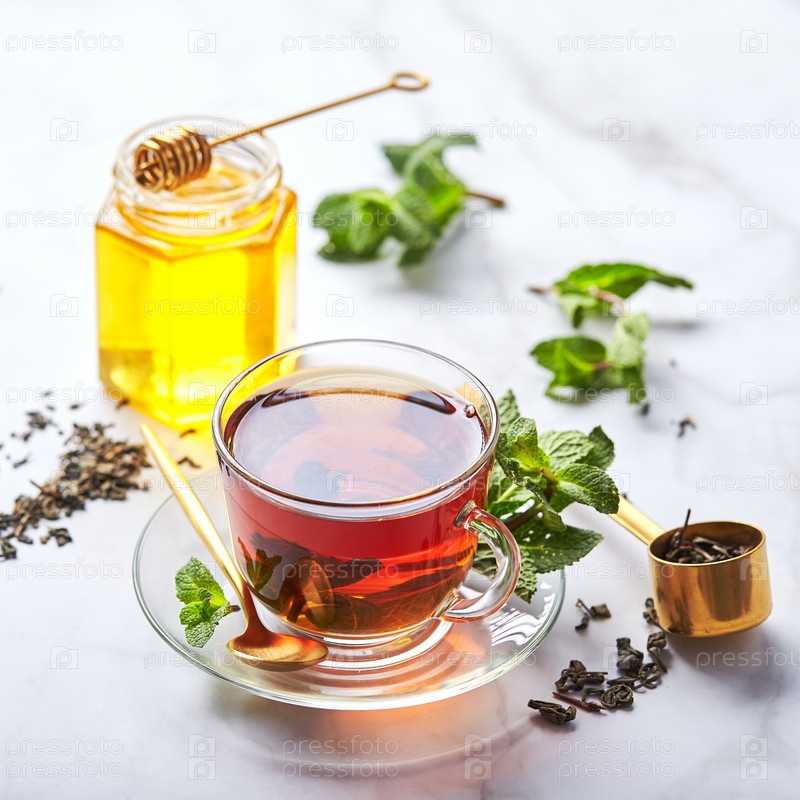 Черный чай в стеклянной прозрачной кружке с листьями мяты и медом. Успокаивающий и восстанавливающий чай, антистресс и релаксация