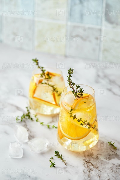 Освежающий коктейль со льдом, апельсином и тимьяном. Освежающий летний домашний алкогольный или безалкогольный коктейль или моктейль или ароматизированная вода на основе Детокса