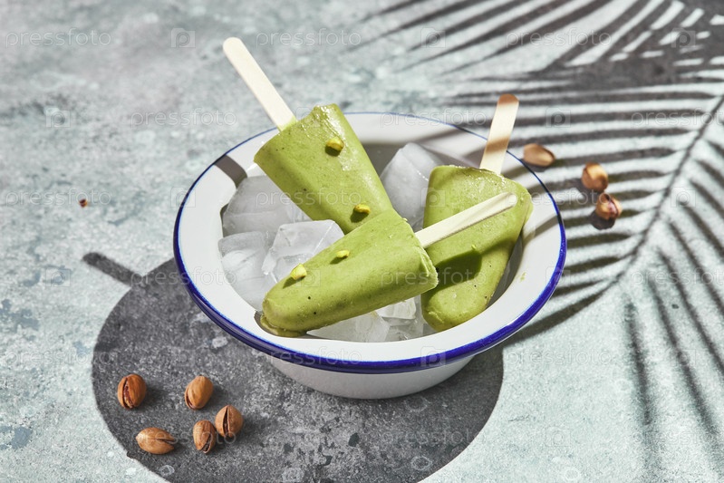 Замороженное домашнее фисташковое эскимо в миске со льдом на сером фоне с тенью пальмового листа в резком свете. Освежающее эскимо, замороженный зеленый сок на палочке. Вид сверху, пространство для копирования