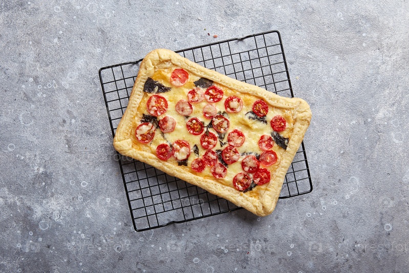 Пирог из слоеного теста с помидорами черри, моцареллой и фиолетовым базиликом