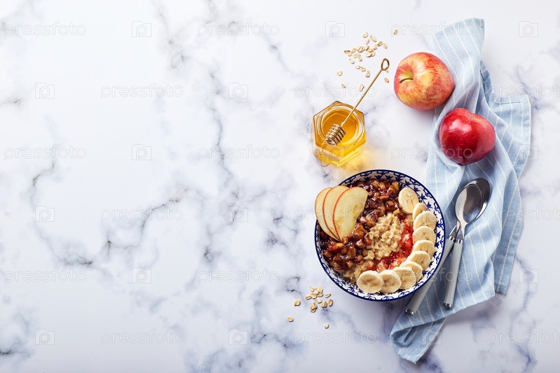 Овсяная каша с карамелизированными яблоками с корицей, бананом, тертой клубникой и медом на светлом мраморном фоне, место для текста сверху