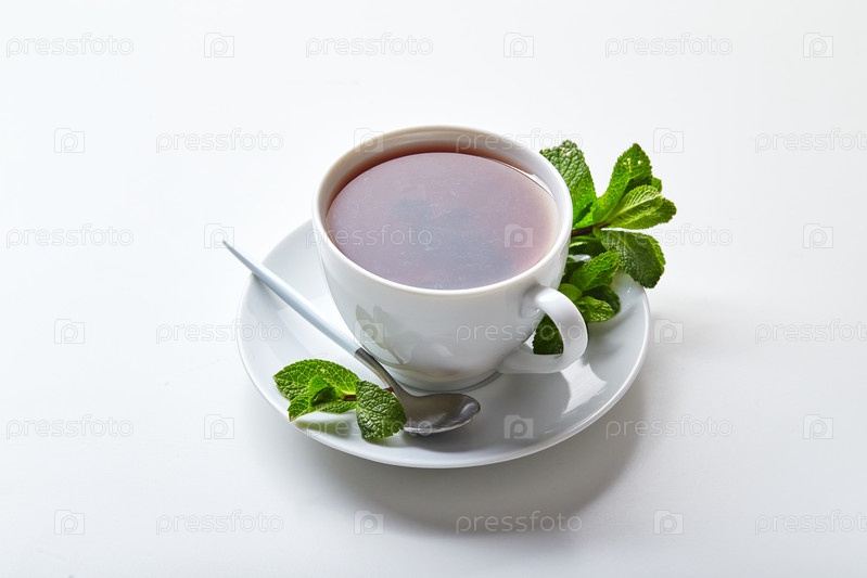 Черный чай в белой чашке с листьями мяты. Успокаивающий чай, антистресс