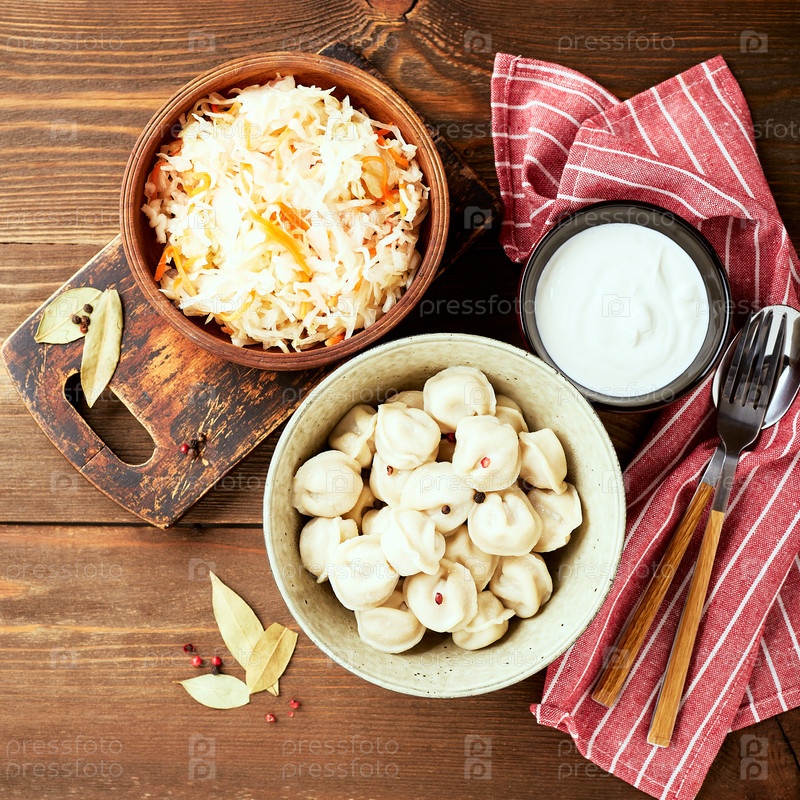 Традиционные русские пельмени со сметаной и квашеной капустой со сметаной на деревянном фоне. Вид сверху, плоская планировка