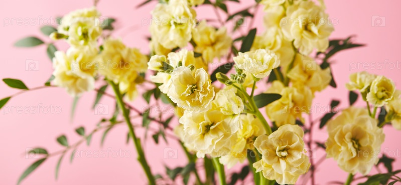 Букет желтой маттиолы с ветвями зеленых листьев на розовом фоне