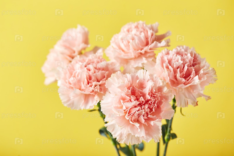 Букет розовых гвоздик. Концепция дизайна праздничного поздравления с букетом гвоздик на желтом фоне
